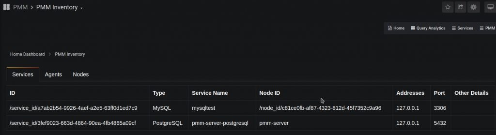 $ ./bin/pmm-admin add mysql --use-perfschema --username=root mysqltest MySQL Service added. Service ID : /service_id/28c4a4cd-7f4a-4abd-a999-86528e38992b Service name: mysqltest |