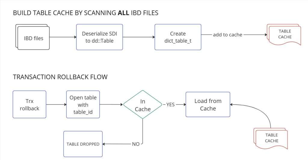 2. “It is done by scanning the B-tree pages of the data dictionary tables mysql.indexes and mysql.index_partitions” –  How about the inflight transaction on these tables. IIUC, they aren’t rolled back yet, right?