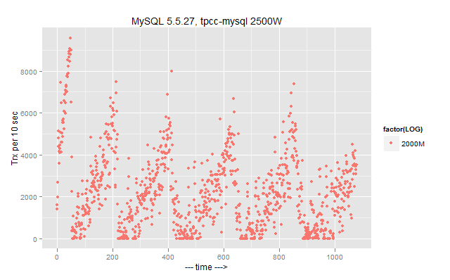 You may see that bigger log files, again, improve overall performance, but not stability. With 2x8G logs, there is no sharp peak like with 2000M – 4G logs, but there I guess we have a flushing of dirty pages (I did not gather stats to check it).