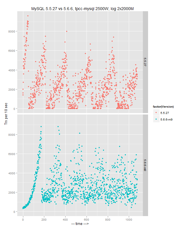 For experiment I took tpcc-mysql workload (3 hours runs), 2500W ( ~250GB of data), on Dell PowerEdge 720 box with 150GB buffer pool and with Fusion-io ioDrive 640GB card. InnoDB log file size 2x2000M for MySQL 5.5, and 2x4GB, 2x8GB for MySQL 5.6.