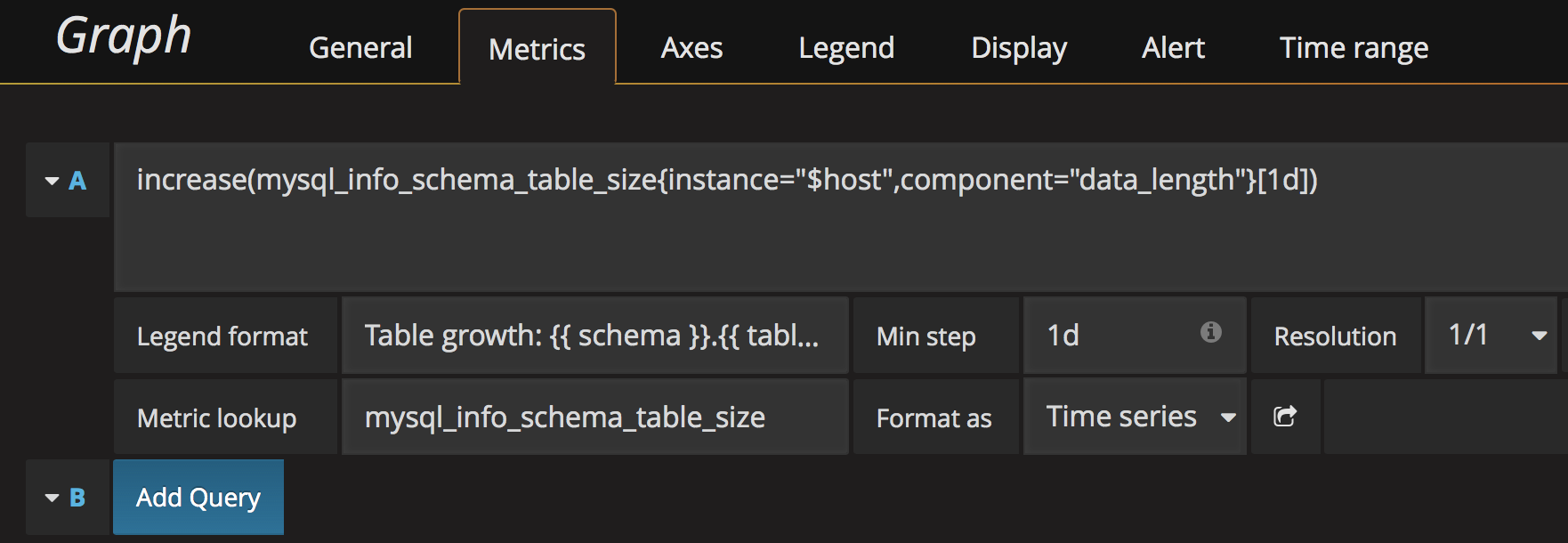 Labels are different per metric, but they are intuitively named. We need the instance and component labels. Instance is the hostname and component is equivalent to the column name of a MySQL table. The component we need is “data_length”.