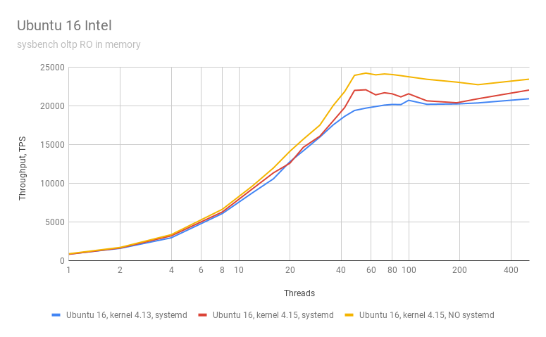 To establish a baseline, I ran the same benchmark on my Intel box, running Ubuntu 16, and I tried two kernels: 4.13 and 4.15