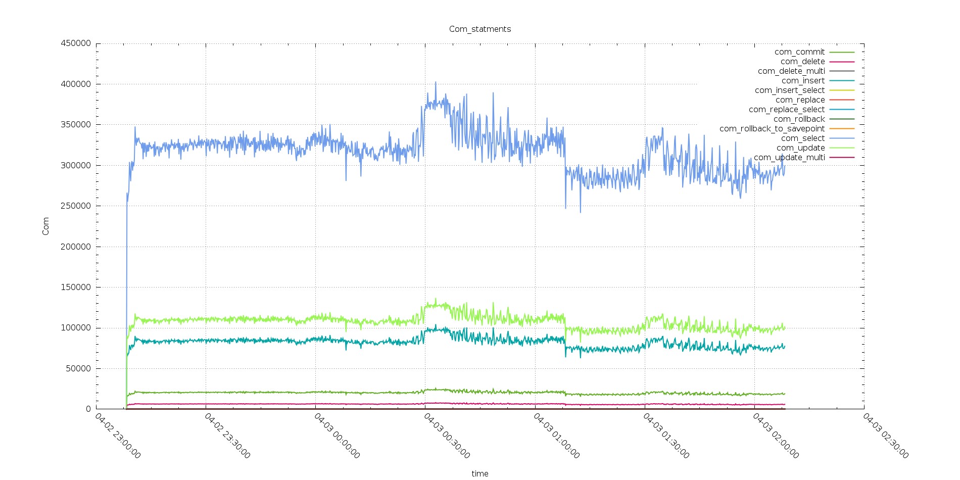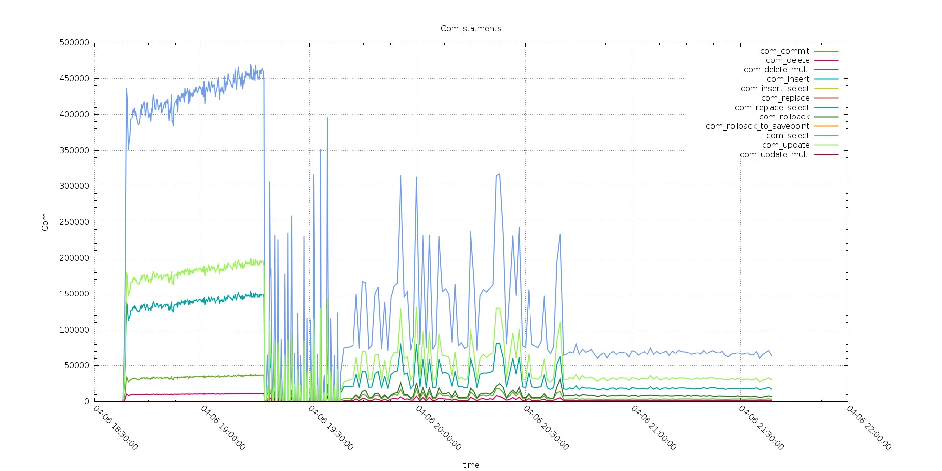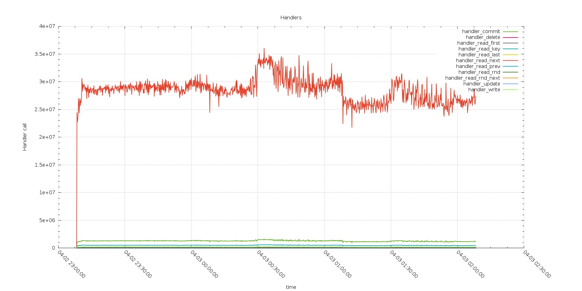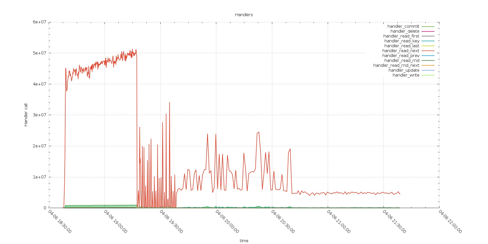 The read calls had an even more divergent behavior, with XtraDB Cluster performing a higher number of read_keys, while Aurora was having a very limited number of them. Read_rnd are very high in XtraDB Cluster, but totally absent in Aurora (note that in Aurora, read_rnds are reported but seem not to increase). On the other hand, Aurora reported a high number of read_rnd_next, while XtraDB Cluster has none.