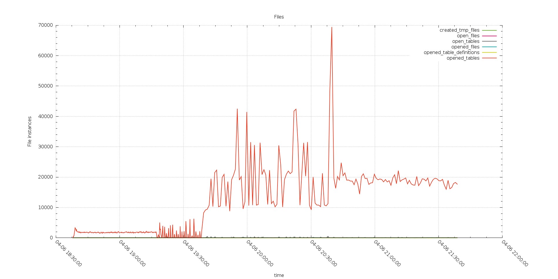The graphs show the instances of files open during the test, not the ones already open. It reflects the Open_file metric “The number of files that are open. This count includes regular files opened by the server. It does not include other types of files such as sockets or pipes. Also, the count does not include files that storage engines open using their own internal functions rather than asking the server level to do so.”