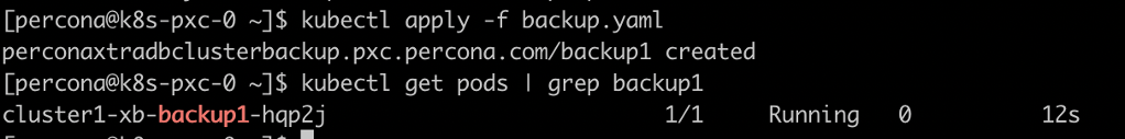 kubectl apply -f deploy/backup.yaml<br>kubectl get pods | grep backup1 |