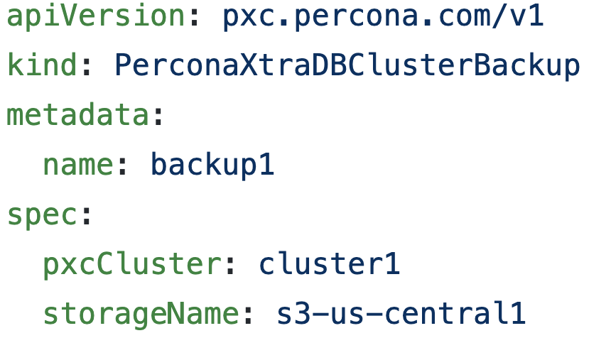 There are two different storage types and backup methods we can use to store backups via the PXC Operator. The first storage type we can use is a Persistent Volume Claim (PVC), which is essentially a ‘ticket’ that requests to use a storage class defined as a Persistent Volume (PV). A PV can be a variety of storage types such as local disk, NFS, or most commonly a block storage (GCP Persistent Disk, AWS EBS, etc.). The second type of storage for backups is by using the S3 protocol or S3 protocol compatible object storage.