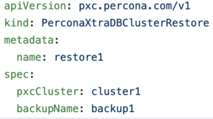 Now that we have the name of the backup, we would edit the backupName in deploy/backup/restore.yaml In order to restore a backup, we would run the following command. We can also get the name of the restoring Pod.