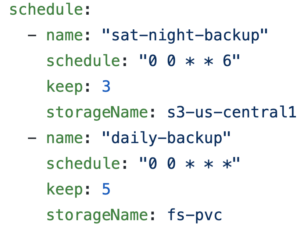 There are also two types of backups we can take in regards to the timing of backups. We can take on-demand backups or scheduled backups. The PXC Operator’s deploy/cr.yaml can be edited to schedule backups that are automated. We can configure the backup schedule using Unix cron string format. We can also take a backup on-demand, by running a single command which we will demonstrate below.