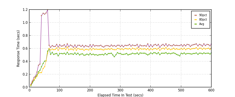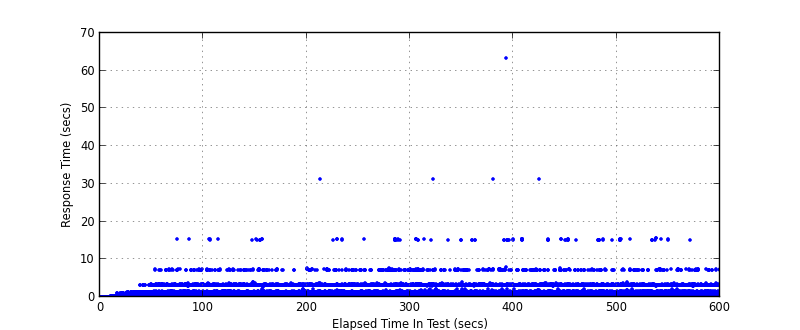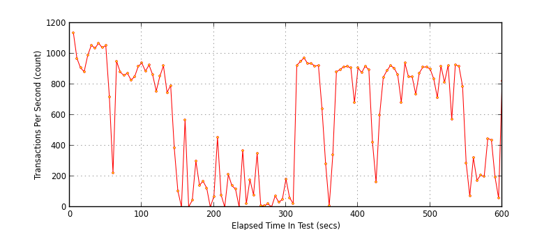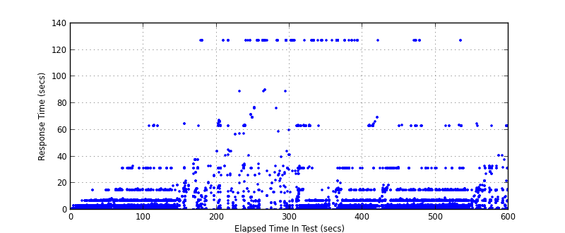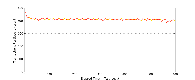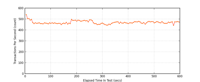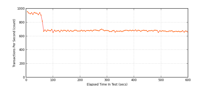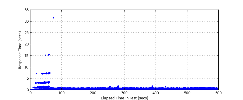 Right away we can see around 500TPS throughput, however as can be seen in both response time graphs there are “outlying” transactions, something is causing the response time to spike dramatically SimpleHTTPServer, how does the twisted alternative compare? (note the benchmarks are from the current HEAD with features re-added to avoid regression, caching and ipv6 support)