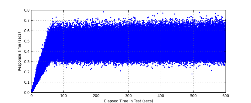First the twisted results, note the initial spike is due to a local python issue where it locked up creating a new thread in multi-mechanize: