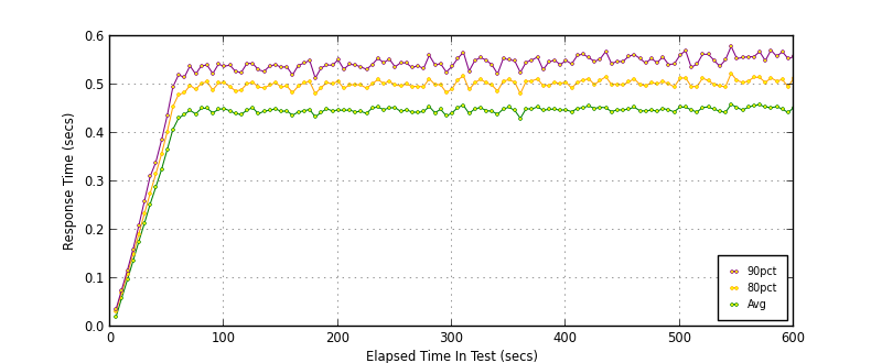 Ouch! We appear to have taken a performance hit, at least in terms of TPS -19% rough estimates however compare the response time graphs to find a much more consistent plot, we had outliers hitting near 70s for SimpleHTTP server, we’re always under 1s within twisted.