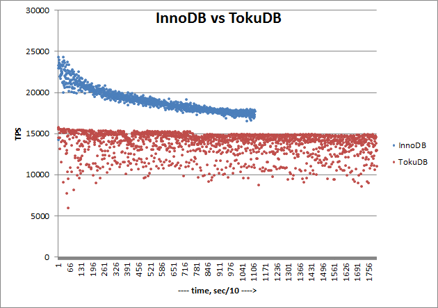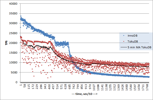 Something to take into account: TokuDB results are not quite stable, that is why I also show 5-minute moving averages to TokuDB.
