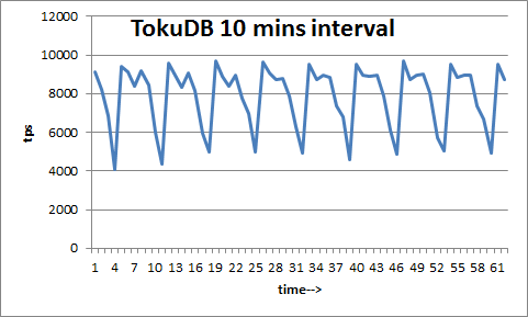 We can see periodical drops, which I believe are related to 60-sec checkpoint interval, as TokuDB does time-based checkpoints.
