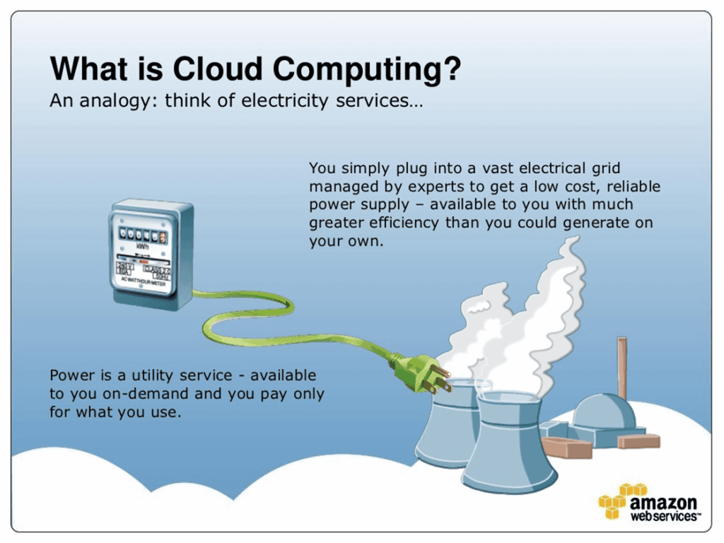 The 2000s gave us the big three—Amazon Web Services (2006), Google Cloud Platform (April 2008), and Windows Azure (October 2008, later renamed Microsoft Azure). The promise was that there was no need to build your own infrastructure; just use compute resources. Below is a famous picture from one of the AWS presentations, where they compared cloud computing with electricity services.