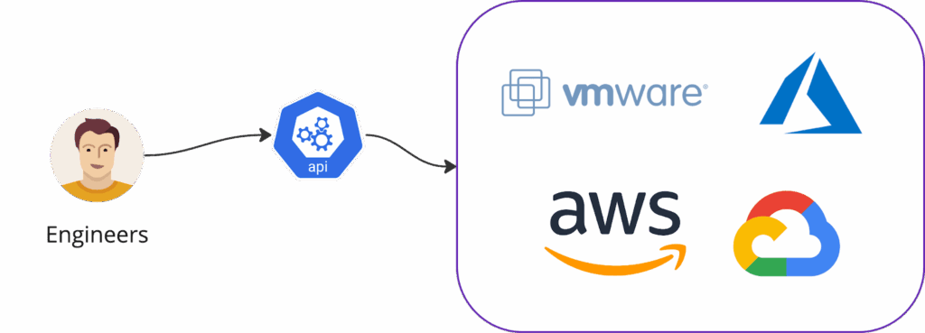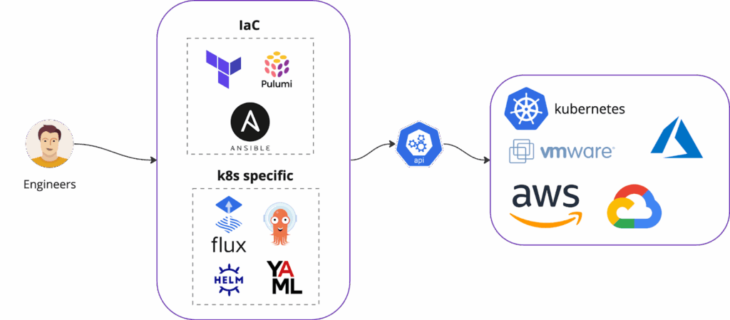 This slowly takes us to the present day, where the big three own approximately 70% of the cloud services market, followed by 100+ other service providers. There are also a wide variety of tools used in platform engineering that expose their own APIs. We mentioned VMWare and OpenStack, but one of them is your favorite container orchestration tool—Kubernetes.