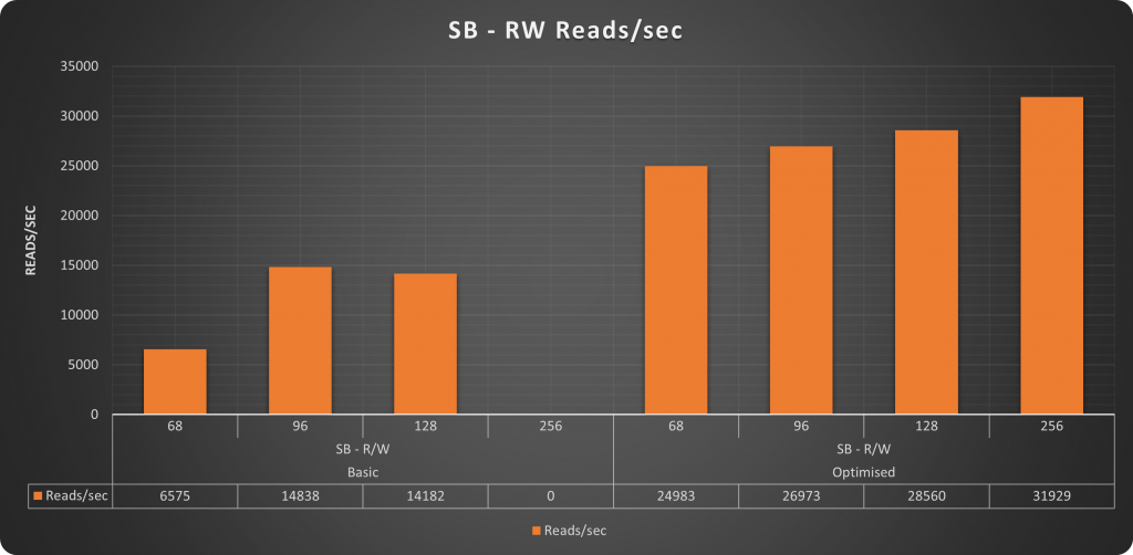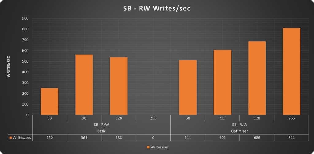 Also for Tpc-c like tests, we have exactly the same trend. Our “optimized” solution was able to serve up to 1516 qps while the “basic” one was able to reach only 322. In this case, the “optimized” solution was not able to scale up to 256 threads, but that makes sense, given the more intense write workload present in this test and the small dimension of the platform.