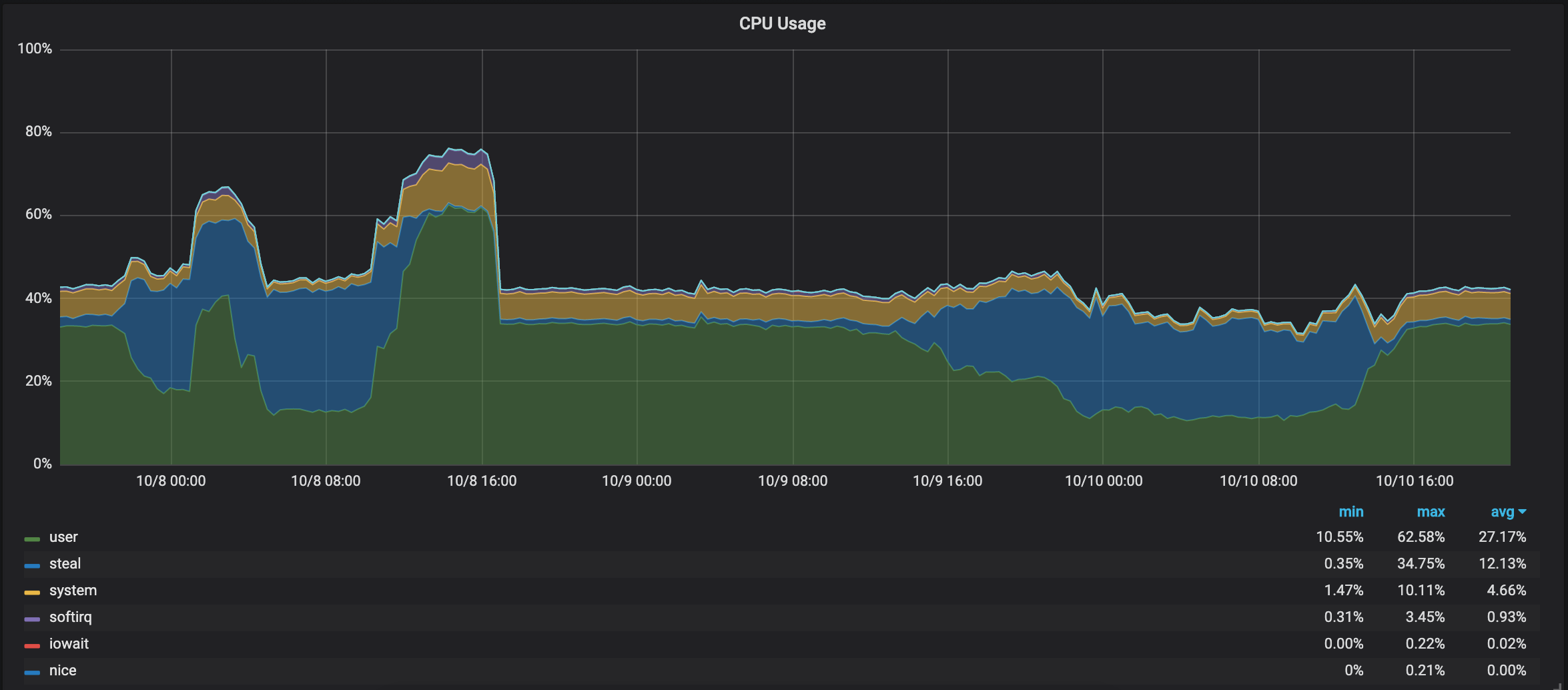 Stealing! A lot of stealing! Here is a good article which explains stealing very well. So probably, I have a noisy neighbor. This instance was running in N. California. I have stopped it and tried to start new instances to repeat the test but I have always gotten very similar results. There was a lot of stealing which was hurting the performance a lot, probably because that region is very popular and resources are limited.