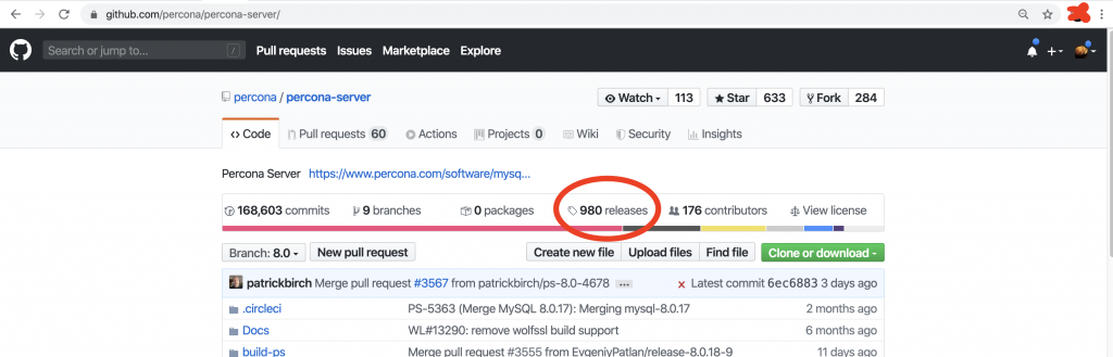 GitHub is pretty easy to navigate and in this case, what we are looking for is Release. 5.7.28-31 to be precise. The Percona Server repo URL is: https://github.com/percona/percona-server/.