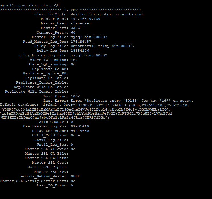 If your table has a primary key or a unique key defined, it then stops replication with error 1062 “DUPLICATE KEY ERROR,” which requires manual intervention to skip a problematic event via SQL_SLAVE_SKIP_COUNTER and resume replication. If there is no primary key or unique key defined then it’s even worse because INSERT may be re-executed and you will get multiple rows with the same data – which again means you’ve got inconsistent data with the master. If you are lucky (i.e. if relay-log.info is already is in sync during crash) then there should be no problem with replication – but that’s not the case most of the time. For UPDATE/DELETE it may cause different errors or no errors on same row.