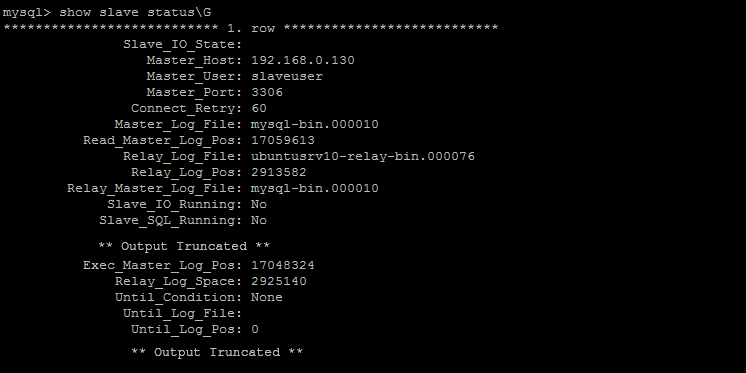 As you can see, the Exec_Master_Log_Pos has been updated to the correct position to resume replication i.e. 17048324. Further, as you can see in the error log, the binary log overwritten message is also there.