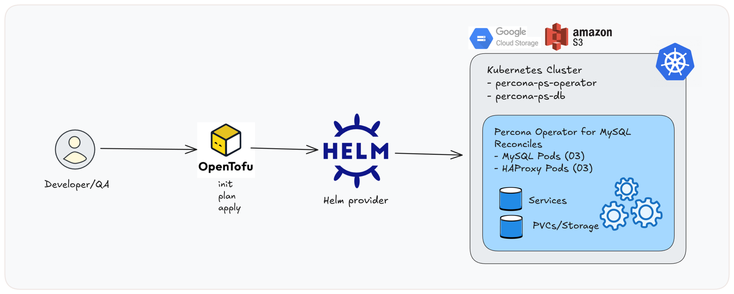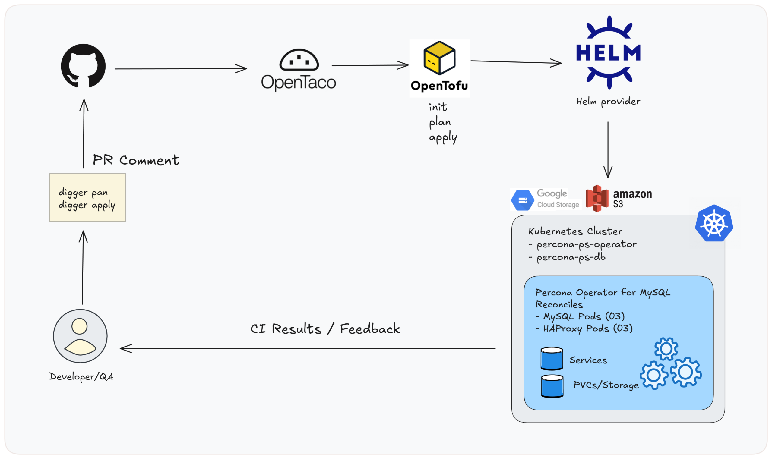 This project automates deploying the Percona Operator for MySQL to Kubernetes using OpenTofu (a Terraform fork) and Digger for CI/CD.