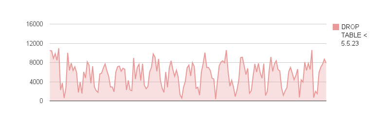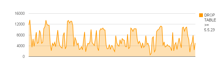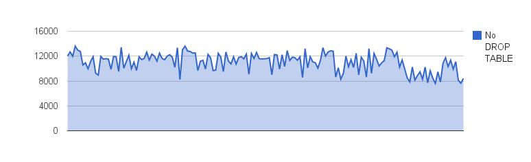 Next comes the benchmark results showing the QPS over 5 second periods with the old DROP TABLE implementation (pre MySQL 5.5.23) and DROP TABLE running in the background: