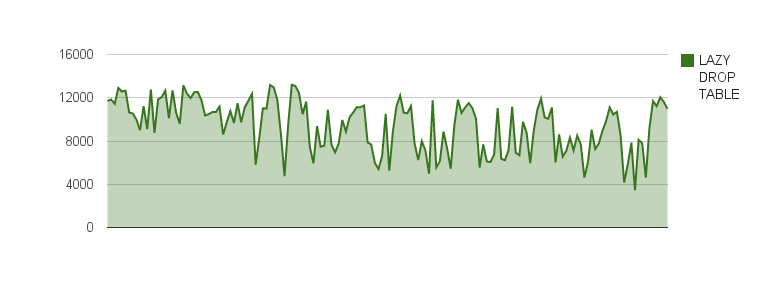 So we can compare the graphs above, and see that there are dips in QPS whenever table is dropped, MySQL 5.5.23 does show an improvement over MySQL version prior to 5.5.23, as the dips are not as regular and as low as in the old implementation of drop table, but the “Lazy Drop Table” implementation wins here. The dips are there in the case of “Lazy Drop Table” but the dips in QPS are not as low or as pronounced as compared to MySQL.