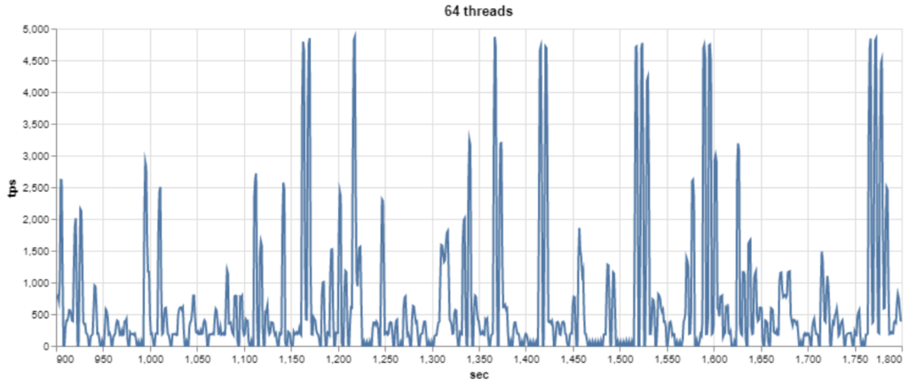 As we can see, there are a lot of variations for threads starting with 2. Let’s check the 8 and 64 threads with 1-sec resolution.