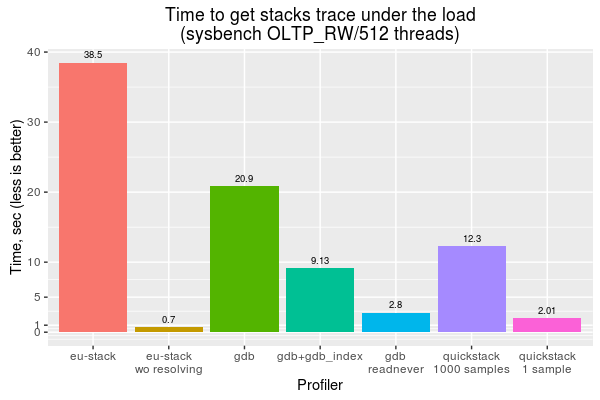 The results show that eu-stack (without resolving) got all stack traces in less than a second, and that Quickstack and GDB (with the readnever patch) got very close results. For other profilers, the time was around two to five times higher. This is quite unacceptable for profiling (especially in production).