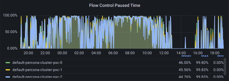 Last week, I started working on a health audit project for a PXC cluster that was recently migrated to Kubernetes and managed by the Percona Operator for MySQL. The first thing I noticed, almost immediately, was how much time the cluster was paused due to Galera’s flow control being triggered by one of the “reader” nodes; from looking at the PMM graphs, that appeared to be happening virtually all the time during business hours (the odd hours in the graph below are due to a mismatch in timezones):