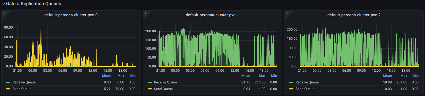 Note this can be a very dynamic occurrence: a cluster can get into and out of flow control virtually all the time. In the environment depicted by the above graph, all writes are sent to the same node, which I’m referring to as the “writer” node, while the other nodes are operating at the limit of their apply queues (175 by default for a 3-node cluster). They need that extra “breathing room” provided by flow control to go back below that threshold mark, but it all happens very fast, which is why it may not have been noticed by anyone:
