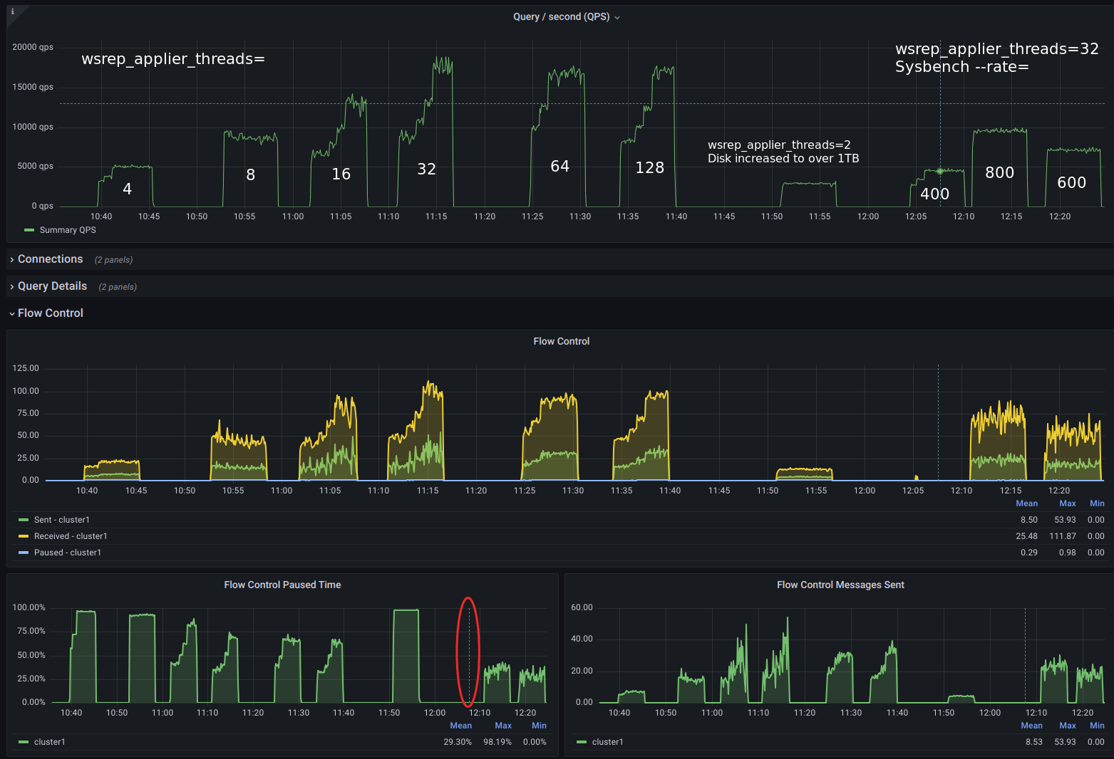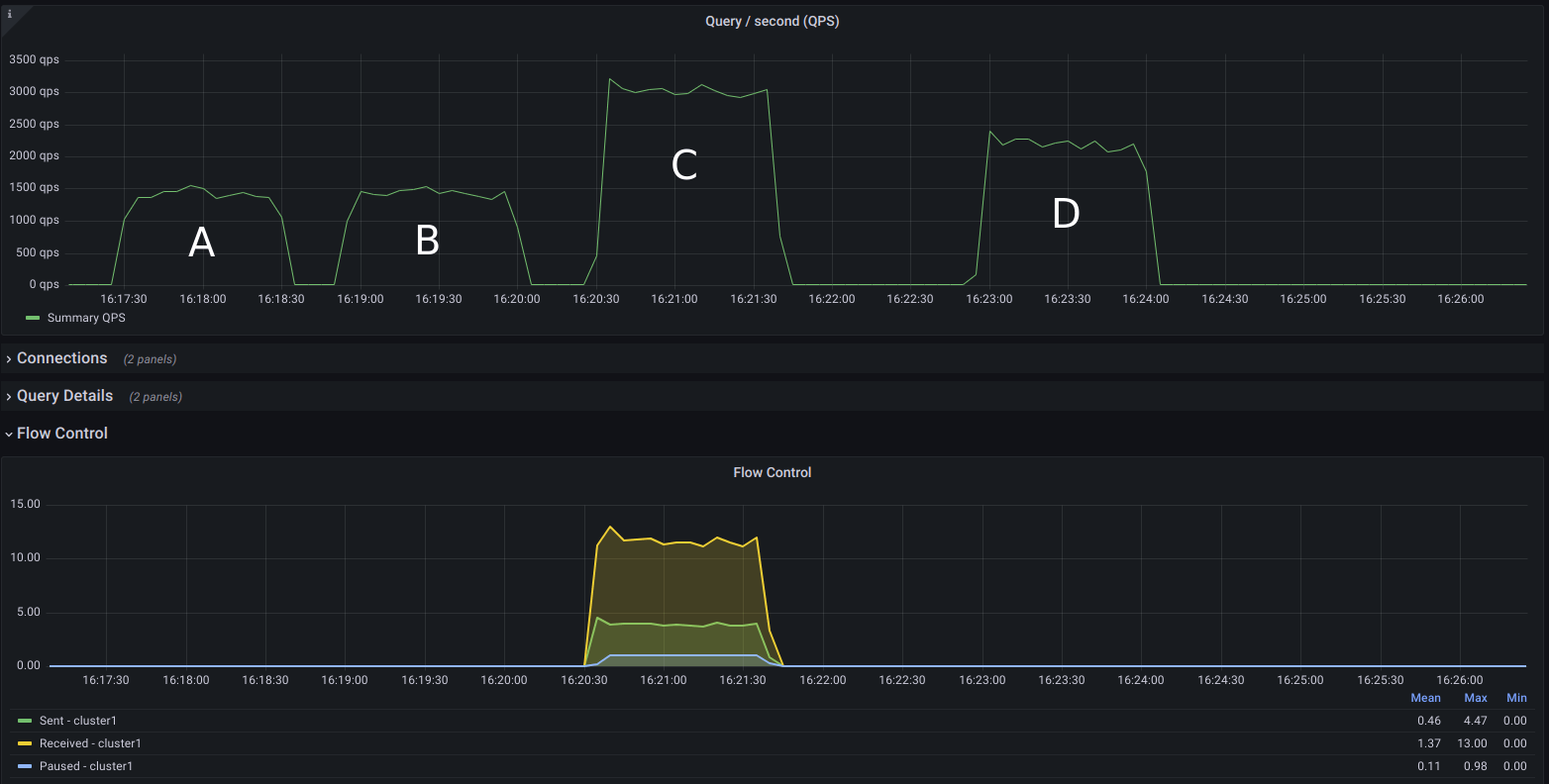 I wanted to show this graph to highlight the fact that, even though we want to avoid flow control, from the limited combinations in the above test, we still got the best query throughput in the scenario where the cluster was in-and-out of flow control the whole time (C). Can it do better? When you get the right configuration for replication, yes.