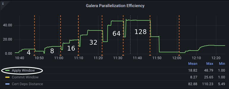 In the tests above, we can say the best replication parallelization was achieved once it was operating with 64 wsrep_applier_threads: