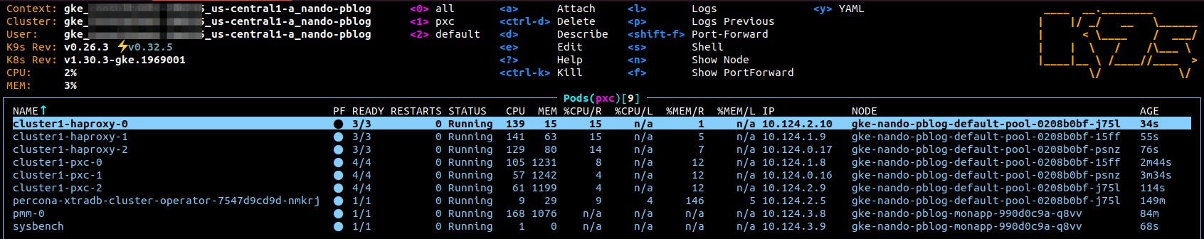 An easy way to navigate around Kubernetes is with the help of K9s Kubernetes management CLI. In the screenshot below, we can see the pods have been scheduled as designed, with the PXC cluster hosted in the main node pool and both the PMM server and Sysbench container running on the “4th node” (monapp):