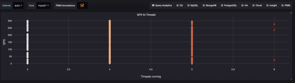 And then we have the desired graph. What is showing is the QPS per threads during the selected time range. That’s the reason why there are several points instead of one, like on regular benchmark graphs, because is not an accumulated value.