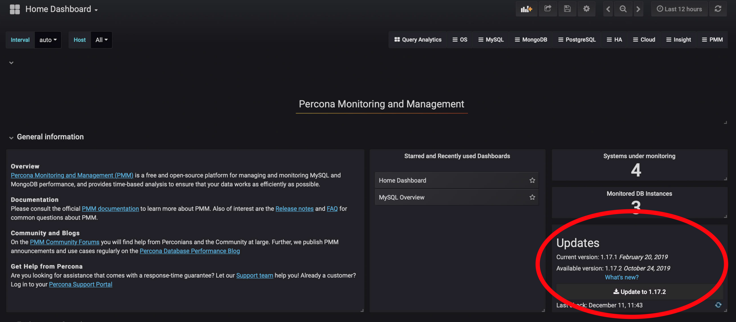 It is worth mentioning that the plugin and the dashboard will survive in-place upgrades of PMM. In-place means using the default PMM upgrade option available in the home dashboard: