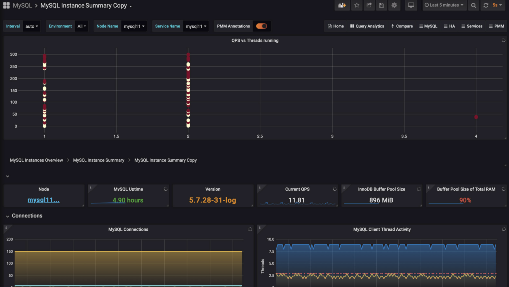 The metrics that we need are already being collected by PMM: mysql_global_status_threads_running (the “Threads running”) and mysql_global_stauts_questions (the “QPS”). Those are added on the regular “metrics” tab: