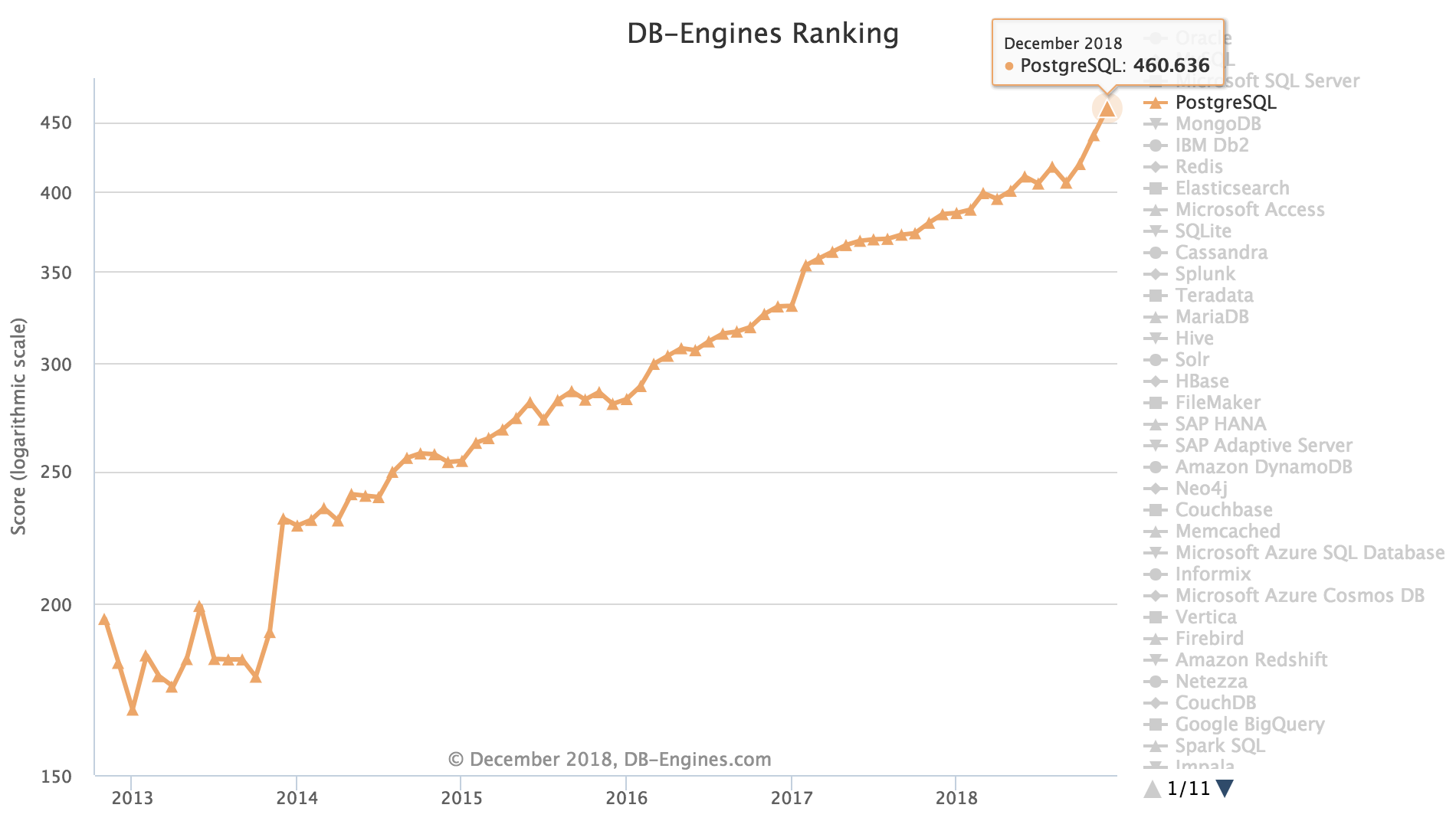 PostgreSQL adoption growth has been increasing year over year, and 2018 has again been one such year as we can see.