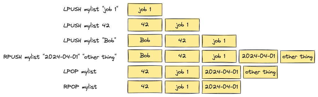 127.0.0.1:6379> LPUSH mylist "job 1" (integer) 1 <-- Returns the number of elements in the list 127.0.0.1:6379> LPUSH mylist 42 (integer) 2 127.0.0.1:6379> LPUSH mylist "Bob" (integer) 3 127.0.0.1:6379> RPUSH mylist "2024-04-01" "other thing" (integer) 5 127.0.0.1:6379> LRANGE mylist 0 -1 1) "Bob" 2) "42" 3) "job 1" 4) "2024-04-01" 5) "other thing" |