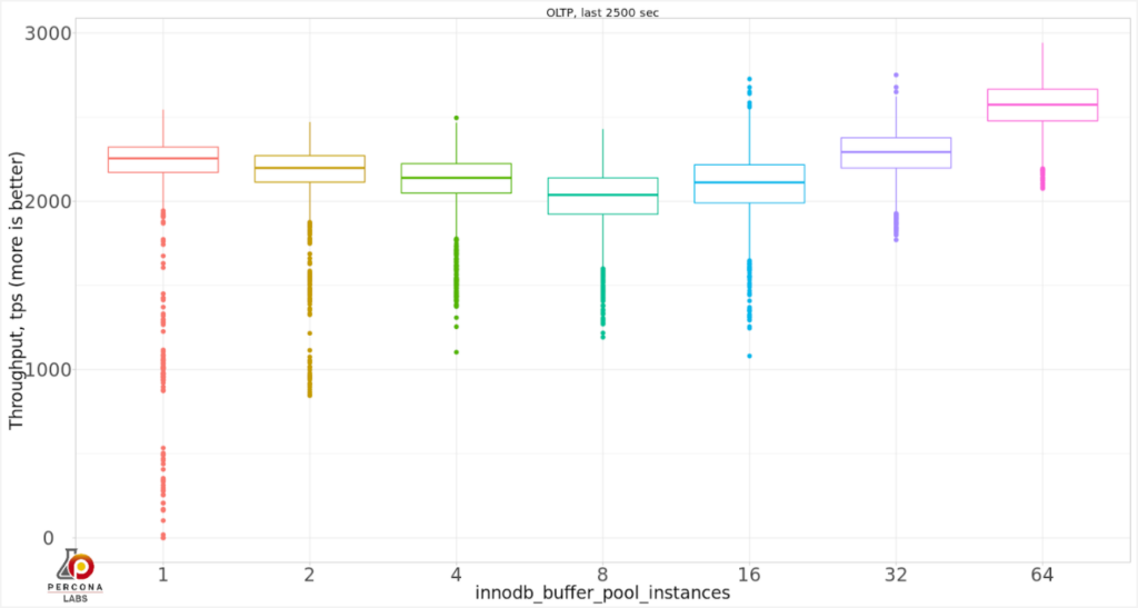 So actually, innodb_buffer_pool_instances=64 showed the best throughput and less variability. Recommended innodb_buffer_pool_instances=8 seems better compared to 1-4 values in a sense of variability, but it does not produce the best throughput.