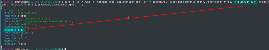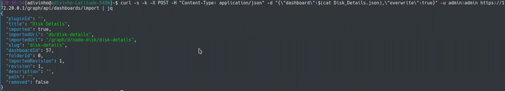 $ curl -s -k -X POST -H "Content-Type: application/json" -d "{\"dashboard\":$(cat Disk_Details.json),\"overwrite\":true}" -u admin:admin https://18.218.63.13/graph/api/dashboards/import |