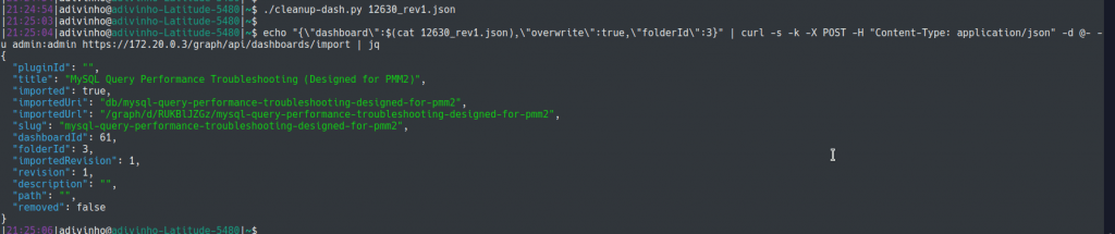 So, here’s another script (cleanup_dash.py) that replaces the datasource fields in dashboards and allows me to pass an importing command. The script takes a dashboard file name as a parameter.