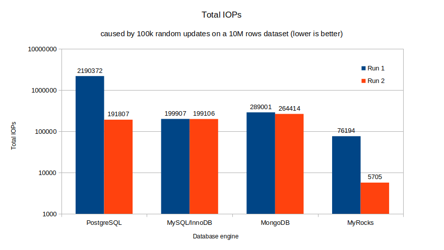 RocksDB is optimized for writes, and it shows. MyRocks demonstrates a significant advantage over other engines. It required about 1/3rd of the IOPs of the second contender (InnoDB) for “Run 1” and, amazingly, only 1/30th of PostgreSQL (2nd best) for “Run 2”. Clearly, if your workload is dominated by writes, and you can cope with slightly slower reads, you should take a look at MyRocks.