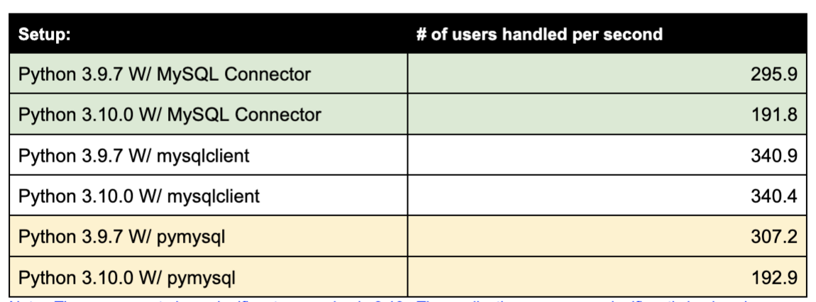 The main difference between the MySQL Connector and mysqlclient is the mysqlclient is using the C libmysqlclient. Oddly the official MySQL Connector says it should switch between the pure python and C version if available, but I was not seeing that behavior ( so I have to look into it ). This resulted in the page load time for the app in Python 3.10.0 taking 0.05 seconds up from 0.03 seconds in Python 3.9.7. However, the key thing I wanted to highlight is that sometimes seemingly small or insignificant changes can lead to a drastic difference in performance and stability. You could be running along fine for months or even years before something upgrades to something that you would not think would drastically impact performance.