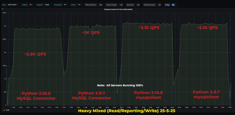 Let me give you an example of something I ran across recently. I noticed that performance on two different nodes running the same hardware/application code was performing drastically different than one another. The app server was running close to 100% CPU on one server while the other was around 40%. Each had the same workload and the same database, etc. It turned out that one server was using Python 3.10.0 and the other was running 3.9.7. This combined with the MySQL Connector/Python lead to almost a 50% reduction in database throughput (the 3.10.0 release saw a regression). However, this performance change was not seen either in my PostgreSQL testing or in testing the mysqlclient connector. It happened only when running the pure python version of the MySQL connector. See the results below: