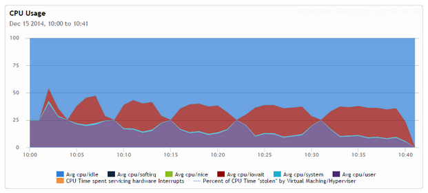 As you can see recovery is essentially close to single core. It also can be CPU bound at times (and will be more so with faster storage) – at certain times of recovery when logs are being scanned it can be completely CPU bound (see how IO wait essentially goes to zero at some times)
