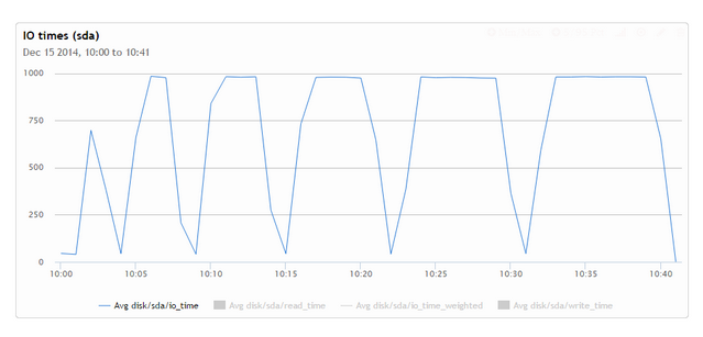 This is an unweighted IO utilization graph where 1000 corresponds to 100% of time where at least one IO request was outstanding. As you can see from this and the previous drive, InnoDB does not keep the IO well saturated all the time during crash recovery.