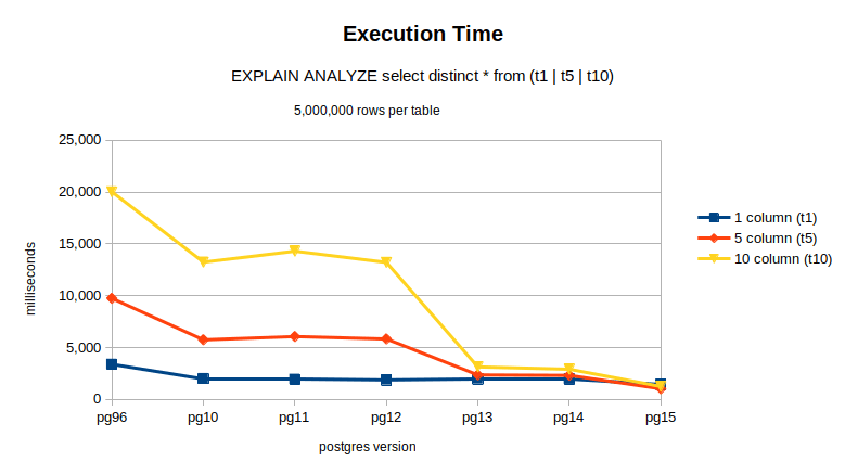 One of the more interesting aspects of the investigation was reviewing the query plans between the different versions of postgres. For example, the query plan for a single column DISTINCT was actually quite similar, ignoring the superior execution time of course, between the postgres 9.6 and 15 plans respectively.