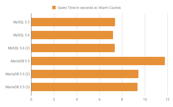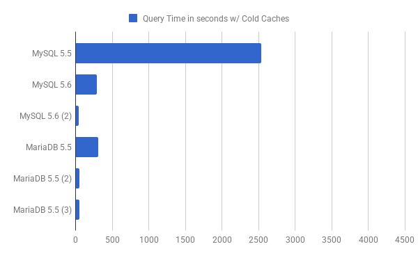 BKA makes a huge difference when the workload is IO bound and the query time drops from 2534.41s down to under a minute. MySQL 5.6 has the smallest query time when the join_buffer_size is set to 6M and the read_rnd_buffer_size is set to 6M. MariaDB 5.5 is close, yet slower by ~10s. Another thing that is important to know is that, just increasing the join_buffer_size is not going to provide the best possible query performance. As I mentioned at the start that BKA uses the MRR interface so you should also adjust/increase the size of the buffer that MRR uses appropriately. In my tests I noticed that with just the join_buffer_size increased to 6M, the query time was ~300s while when both the join_buffer_size and the read_rnd_buffer_size/mrr_buffer_size were set to 6M, the query time dropped to ~40s. So the maximum possible benefit is when size of both the buffers is increased appropriately. Also in the chart above the bottom two bars correspond to MariaDB with Hash Join and Key-ordered Scan enabled, and MariaDB with Hash Join and Key-ordered Scan disabled, and the only difference in query time is 48.78s vs 48.91s, so I don’t see Hash Join and Key-ordered Scan making much of a difference here.