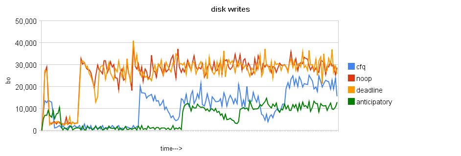 Here is graph of disk writes (column bo in vmstat) during benchmark